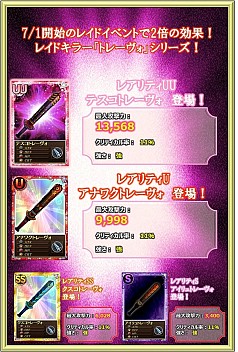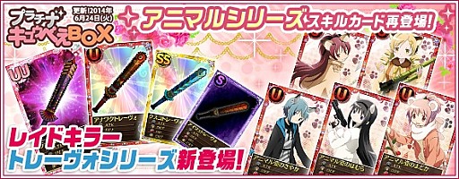 6月24日(火)より「プラチナキュゥべえBOX」の更新を実施しました。レイドキラーに「トレーヴォ」シリーズが新登場しました。また、アニマルシリーズのスキルカードも再登場となっております。10回一括オープン機能を利用すれば、UU武器またはレイドキラーが必ず手に入りますので、この機会にぜひご利用ください。
