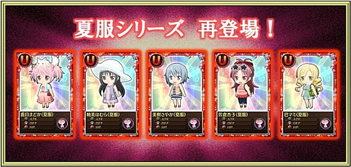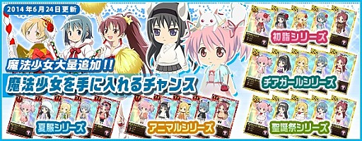 6月24日(火)より「プラチナ魔法少女キュゥべえBOX」の更新を実施しました。レアリティU魔法少女で、アニマルシリーズ、夏服シリーズが再登場!また、初詣シリーズ、チアガールシリーズ、聖誕祭シリーズも再登場となっております。