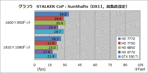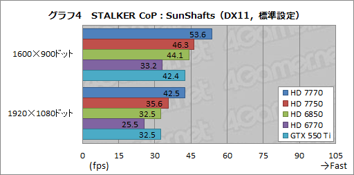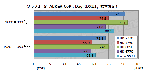 グラフ2〜5は,「S.T.A.L.K.E.R.:Call of Pripyat」(以下,STALKER CoP)から,最も描画負荷の低い「Day」シークエンスと,逆に最も描画負荷の高い「SunShafts」シークエンスの結果となる。まず,グラフ2,3に示したDayから見てみると,全体的には3DMark 11の結果を踏襲。ただし,HD 7750はGTX 550 Tiに若干引き離された。