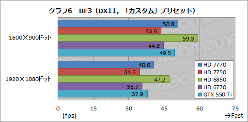 グラフ6,7は,同じくDirectX 11世代のタイトルとなるBF3の結果だが,ここではとくに負荷の低いカスタムプリセットでHD 7770がHD 6850に引き離されている点が気にかかる。メモリ周りのスペック的には不利なはずの最高プリセットで差を縮めているあたりからは,GCNアーキテクチャにおけるROP最適化の効果も強く感じられるが,置き換え対象に歯が立たないのもまた事実だ。ドライバレベルの最適化が進んでいるGTX 550 Tiと一進一退の攻防を演じているのも,プラス材料ではない。