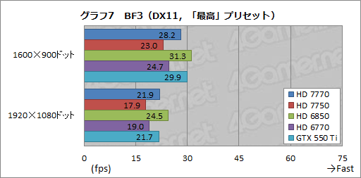 なお,HD 7750はHD 6770に若干届かず,今回テストした5製品中の最下位に沈んだ。
