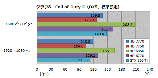 「Call of Duty 4: Modern Warfare」(以下,Call of Duty 4)では,Radeon HD 7700シリーズにいいところがない(グラフ8,9)。Call of Duty 4では,シェーダプロセッサ,ひいてはテクスチャユニット性能がスコアを左右しやすいため,HD 7750はともかく,HD 7770では少なくともコアクロック1GHz動作の効果が出てこないとおかしいのだが,それが見えないのだ。