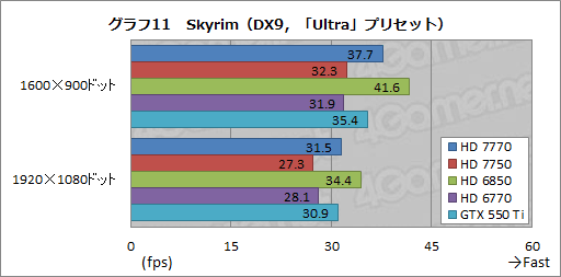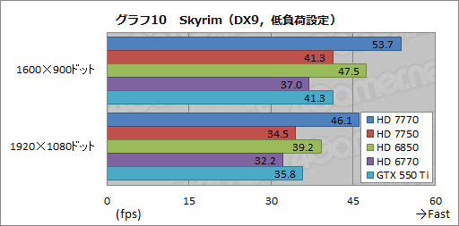 というわけでグラフ10,11は,Call of Duty 4と同じDirectX 9.0c世代ながら,最新世代の3DゲームタイトルとなるSkyrimの結果だ。Skyrimではグラフィックス設定を高くするとグラフィックスメモリ周りがスコアを大きく左右するようになるため,16 ROP,128bitメモリインタフェースのRadeon HD 7700シリーズはかなり不利なのだが,そんななか,低負荷設定でHD 7770がトップスコアを示したのは注目したいところである。