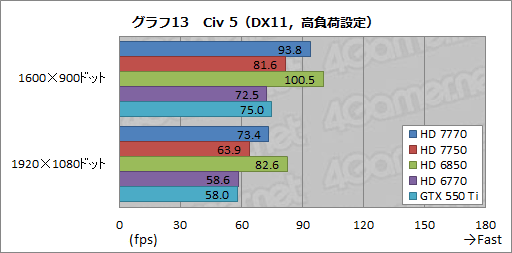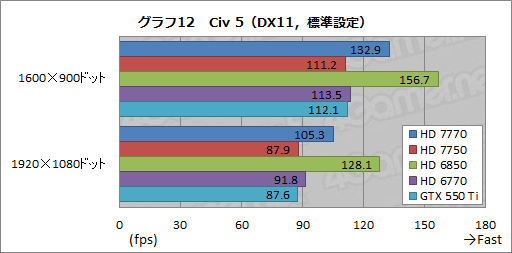 グラフ12,13は「Sid Meier's Civilization V」(以下,Civ 5)のテスト結果。HD 6850が頭1つ抜けている点や,高負荷設定でHD 7770とHD 6850のスコア差が縮まる点を見るに付け,BF3と似た傾向になっていると述べていいだろう。