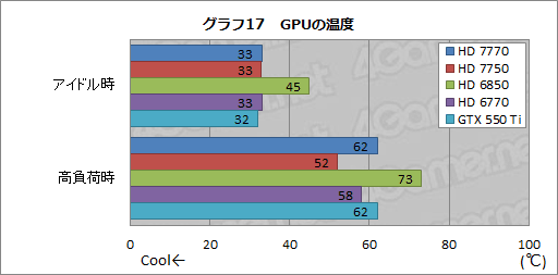 「HD 6770やGTX 560 Tiと変わらない」と思うかもしれないが,これは,両製品がいずれも,グラフィックスカードベンダー独自のGPUクーラーを採用しているため。リファレンスクーラーで高負荷時にHD 7770が62℃,HD 7750で52℃というのは立派だ。