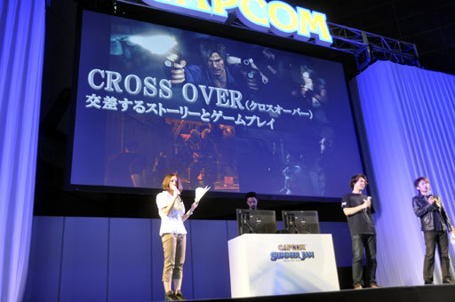 「クロスオーバー」のデモプレイが披露された。クロスオーバーとは,レオン,クリス,ジェイクらのストーリーが,ストーリーのみならずゲームプレイの部分においてもつながっていくというもの。クロスオーバーに関しては「