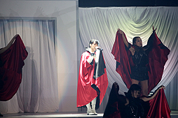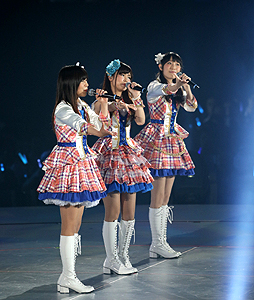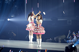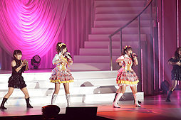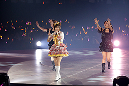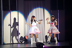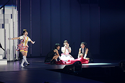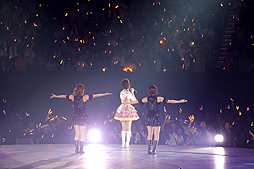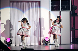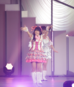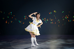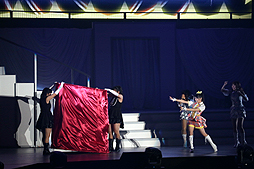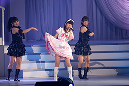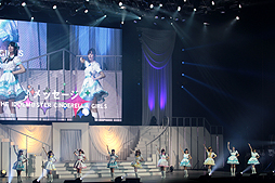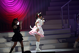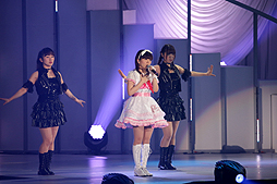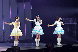 また,衣装もおニューとのことで,ジャケットにフリル付きのスカートまたはパンツと,全体のイメージは前回ライブのときと似ているが,ディテールは異なるようだ。ちなみに城ヶ崎美嘉役の佳村さんはネクタイを蝶結びにしており,これは美嘉のレアカードがそうなっていたからとのこと。こういう細かいこだわりが,ファンには嬉しい。また,パーティーということで,白をベースにしたエプロンドレスに着替えて登場する場面もあり,こちらはかなりかわいいんじゃないかしら。