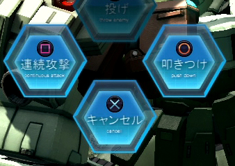 タックルがHITし、グラップル成功すると「□連続攻撃」「△投げ」「○叩きつけ」の3択が表示されます。