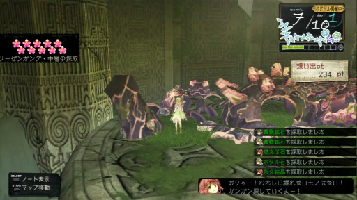 マップ内の採取ポイントで採取を行うというのはシリーズとおして変わらないが,今作では採取の際にアイテムボックスを開いて「拾う/拾わない」の選択をする必要がなくなり,採取ポイントでボタンを押し続ければ,勝手に採取してくれるようになっている。