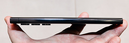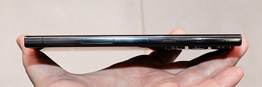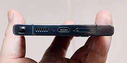 ![]() 底面はUSB Type-CポートやSIMカードスロットが並ぶ。左側にあるのがS Penだ |