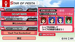 さて,上記のようにSTAR OF FESTAでは1回のステージで3曲を歌うのだが,3曲目についてはライバル達と対戦することが可能になっている。さまざまなライバル達がSTAR OF FESTAに参加しており,同じ会場の別のステージでライブを行っているという設定は,なんとなく「アイドルマスター2」(PlayStation 3/Xbox 360)の「フェス」を思わせる。
