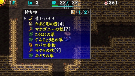 新しく追加されたダンジョンのなかで、唯一夜がある「草と巻物の洞窟」。名前の通り、このダンジョン内で入手できるアイテムは草と巻物のみ。さらに装備品は一切持ち込めない。持っている道具の使い所、昼夜のどちらの間に探索を進めるかの判断など、慎重に行動しなければ、簡単に倒されてしまう玄人向けのダンジョンと言える。