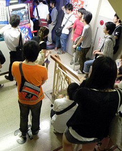なお,店舗の入り口や3階の踊り場には,プレイの様子をチェックできるモニターが用意されているため,その映像を話の種にして,多くのプレイヤーが交流を深めていた。新技や新しいコンボが確認できたときには一斉に驚きの声が上がる。こういったなごやかな一体感は,若いプレイヤーや女性ファンの多い,「BLAZBLUE」シリーズ最新作だからこそなのかもしれない。