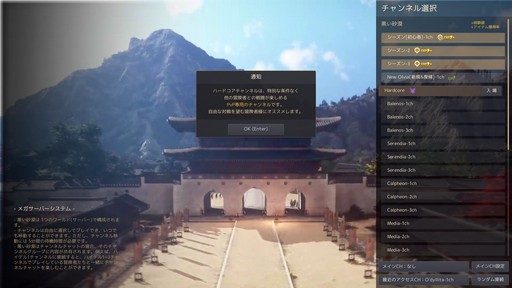 まず,ゲーム起動後のチャンネル選択画面から「Hardcore」を選択する。「PvP専用チャンネル」の注意書きが表示され,その後キャラクター作成や選択画面になる。