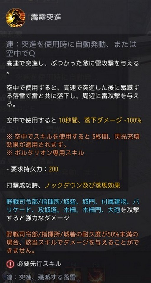 「殲滅する落雷」は前足蹴り(Fキー)時に自動発動,または空中でFキーを押すと発動する。
