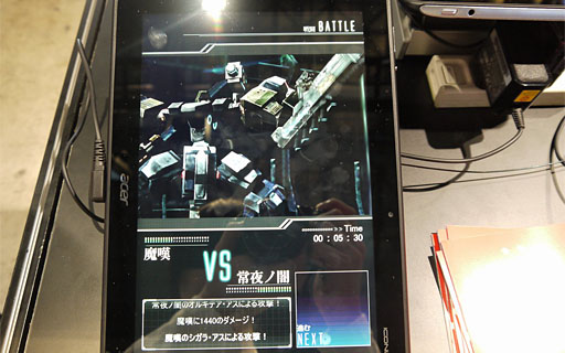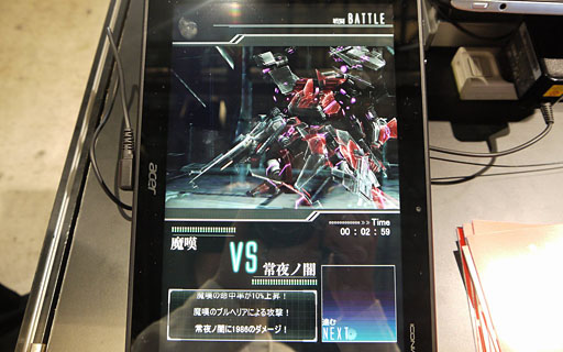 東京ゲームショウのアークシステムワークスで,ダマスカスギヤはプレイアブル展示されている。試遊バージョンということで,とくに頭を悩ませず適当に画面をタッチしているだけでゲームが進んでしまうため,キモのカスタマイズ部分を堪能するのは少し難しいのだが,豊富なパラメータや作りこまれた戦闘演出などからは,本作がライト路線でないことをはっきりと確認できるはずだ。