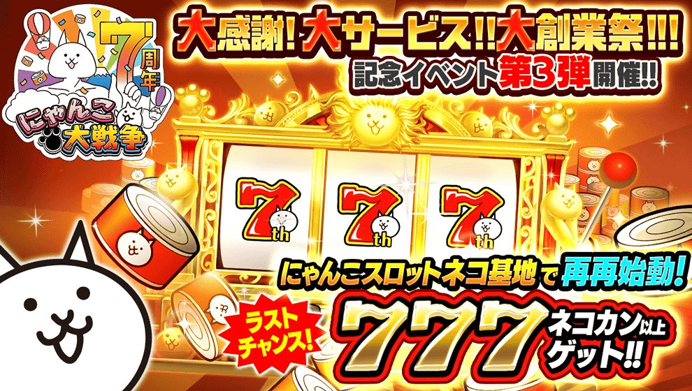 「にゃんこ大戦争」,7周年記念イベント第3弾。「にゃんこスロット」や「降臨祭」など