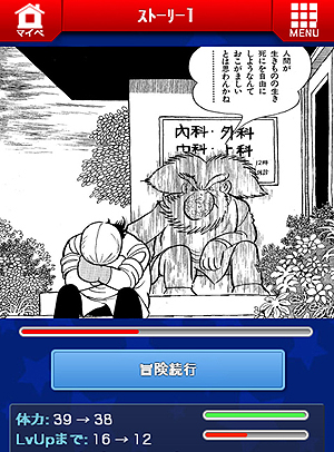また面白いのが,ゲーム中に手塚作品を立ち読み感覚で読める「冒険」というシステムを搭載している点だろう。これは,一般的なソーシャルゲームに見られる,いわゆる待ち時間(行動力の充填時間など)に,登場作品のあらすじを読めるという仕組み。「未だ手塚漫画を知らない,若い世代へ届けたい」という想いが,「冒険」システムという形で具現化されているわけだ。