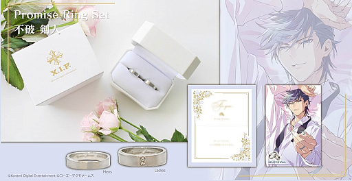 | ○ラインナップ | 【全6種類】 各リングの内側には「TogetherForever」の文字が彫り込まれています。 ●音羽慎之介モデル シルバーのリボンが結ばれた繊細なデザイン。小粒のクリスタルガラスがアクセントになっています。 購入特典 ①音羽慎之介からのプロミスメッセージカード1点 ②ビジュアルポストカード(音羽慎之介)1点 合計2点セット ●霧島 司モデル シルバーカラーがシンプルながら洗練された印象のリングセット。 購入特典 ①霧島 司からのプロミスメッセージカード1点 ②ビジュアルポストカード(霧島 司)1点 合計2点セット ●辻 魁斗モデル 華やかなピンクゴールドがかわいらしい印象のデザインです。 購入特典 ①辻 魁斗からのプロミスメッセージカード1点 ②ビジュアルポストカード(辻 魁斗)1点 合計2点セット ●不破剣人モデル シルバーの二つの輪が重なっているデザインです。 購入特典 ①不破剣人からのプロミスメッセージカード1点 ②ビジュアルポストカード(不破剣人)1点 合計2点セット ●伊達京也モデル 流れるような曲線とゴールドがアクセントになっているリングセットです。 購入特典 ①伊達京也からのプロミスメッセージカード1点 ②ビジュアルポストカード(伊達京也)1点 合計2点セット ●神崎 透モデル アンティークシルバーの質感とダイヤのようなカットが個性的でありつつ、普段使いにもお使いいただけます。 購入特典 ①神崎 透からのプロミスメッセージカード1点 ②ビジュアルポストカード(神崎 透)1点 合計2点セット |