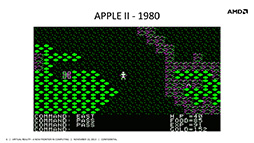 | 講演で提示されたグラフィック表現の例。左は,Apple II用に1982年に登場した「Ultima II」で,右は2012年に登場した「RAGE」の画像。劇的な変化を遂げはしたが,その方向性は偏っていたのではないかと,Iribe氏は問いかける | |