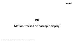 では,どういう方向で進化すれば,ゲームの映像体験に革新的な違いをもたらせるのか? Iribe氏が示した答えは,Riftに始まるOculus VRの「Motion-Tracked Orthoscopic Display」。意訳すれば「動きに追従して正しい映像を見せるディスプレイ」といったところだが,さすがに英語でも長すぎるので,Iribe氏はシンプルに「VR(バーチャルリアリティ)ディスプレイ」と表現していた。