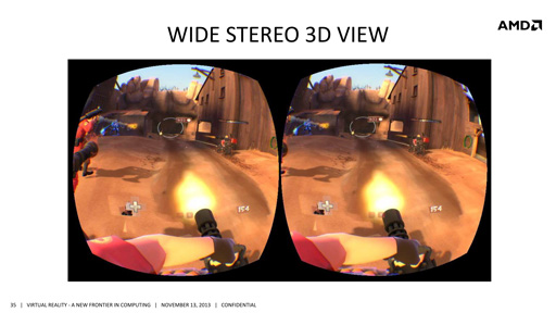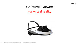 HMDや3D立体視といった要素は,Riftだけのものではない。ソニーの「HMZ」シリーズは,その好例だろう。だがIribe氏は,そうしたHMDとVRディスプレイは違うものとしている。「既存のHMDが,プレイヤーの映像体験に立体感や没入感をもたらした功績は大きい。しかし,依然として映像は目線の前に固定されたもので,左右の目それぞれに見せるピクセルを増やしただけという,従来の映像表現の延長線上の進化に留まっている」とIribe氏は述べ,VRディスプレイとは目指す方向性が異なると説明した。
