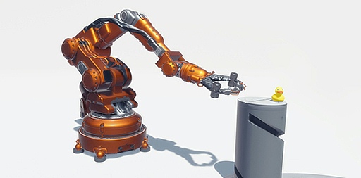- プレイヤーの周囲でラバーダック(アヒルのおもちゃ)を取り合う2体のロボットアーム