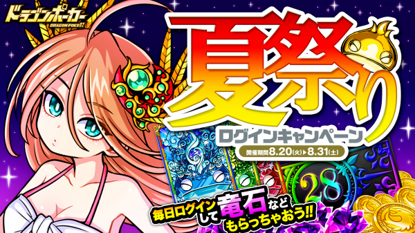 「ドラゴンポーカー」,竜石が最大15個獲得できる「夏祭りログインキャンペーン」が開催