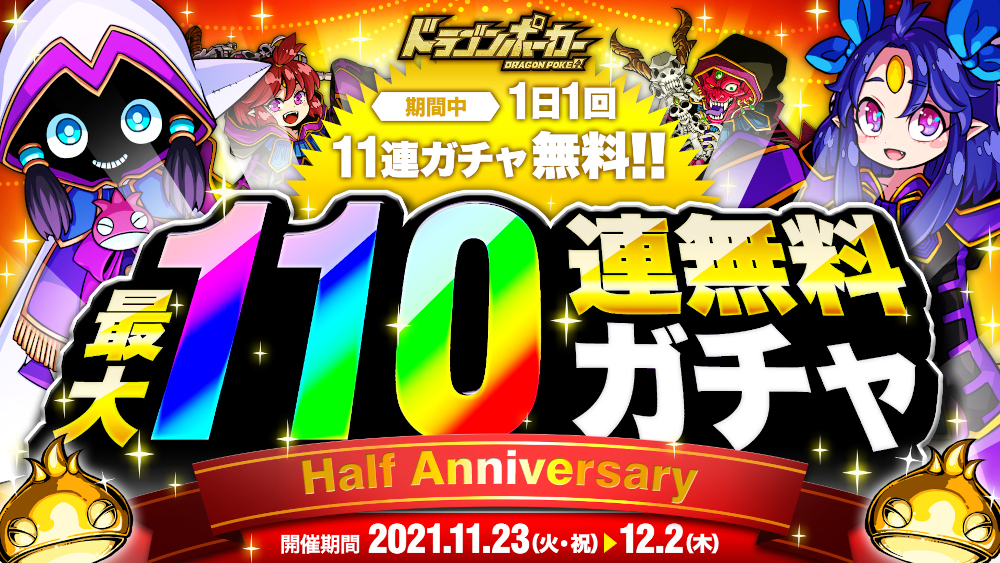 「ドラゴンポーカー」“ハーフアニバーサリー無料最大110連ガチャ”が11月23日より開催