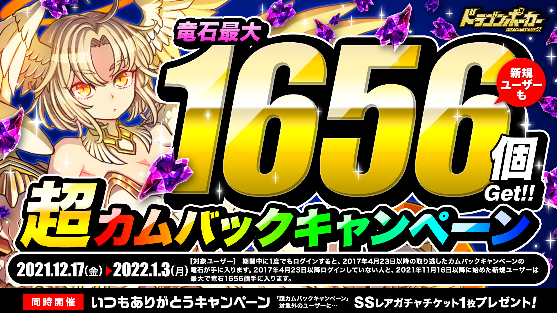 「ドラゴンポーカー」で竜石が最大1656個が獲得可能なカムバックキャンペーンが開催