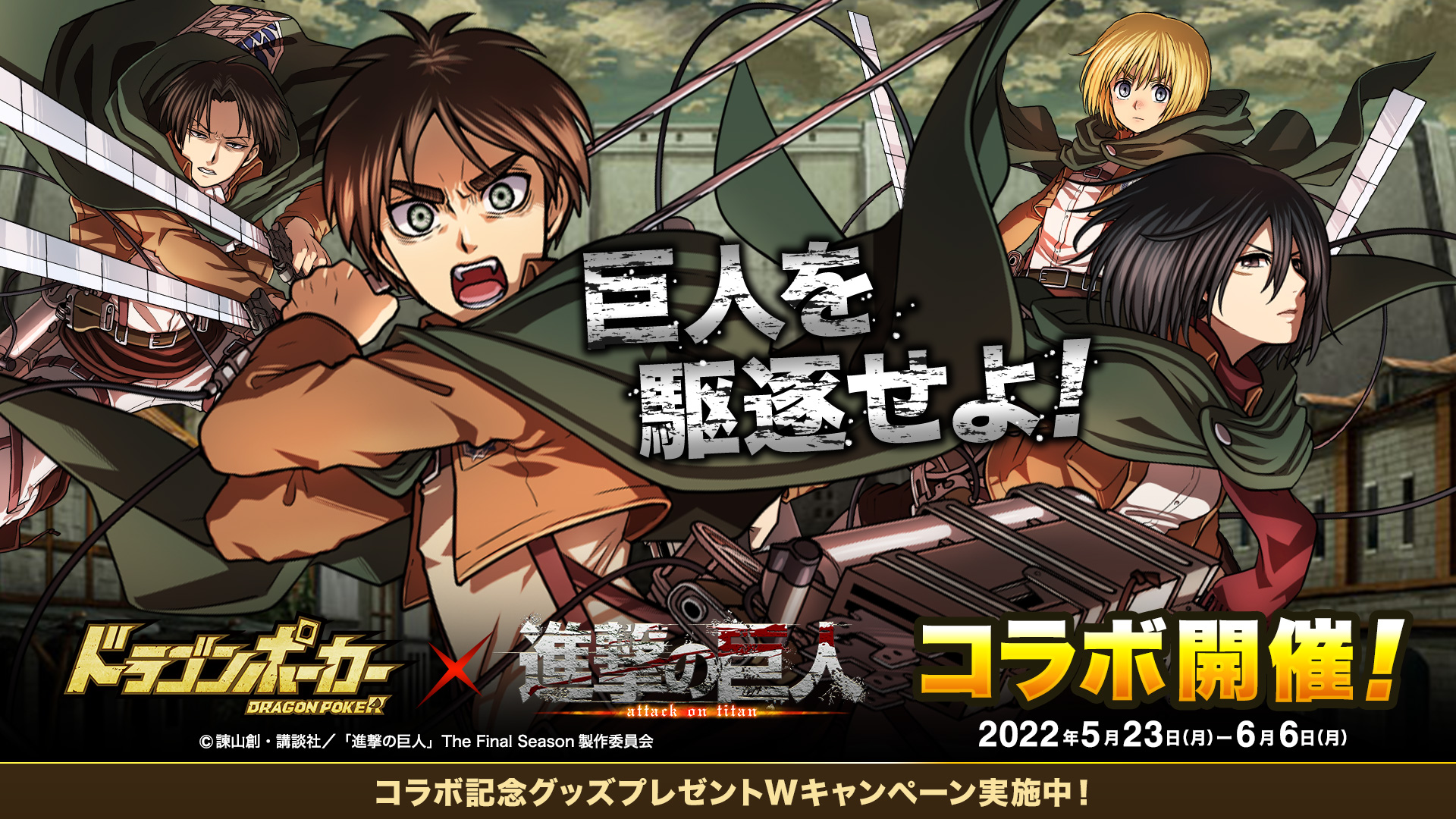 「ドラゴンポーカー」、「進撃の巨人」のコラボカードが当たるTwitterプレゼントキャンペーンを実施
