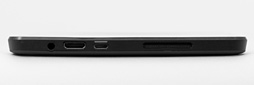 先ほど写真のキャプションで,インタフェースは本体向かって左端に並ぶと述べたが,そこにあるのは外部ディスプレイ出力用のHDMI Mini Type C(※HDMI 1.4a対応)とUSB 2.0 Micro-B(※USB 2.0クライアントモードとUSB 2.0ホストモード兼用),4極・3極両対応の3.5mmミニピン型ヘッドセット&ヘッドフォン接続端子である。