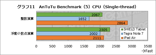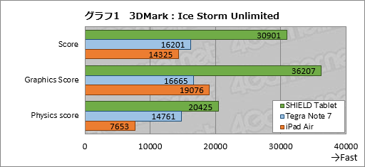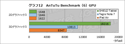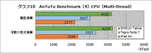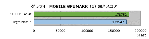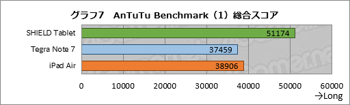 まず,総合スコアを見てみる(グラフ7)。SHIELD TabletはTegra Note 7比で約1.37倍のスコアが得られた。iPad AirはTegra Note 7より少し高い程度だ。