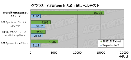 実際,「低レベルテスト」として用意されているテストを実行してみると,シェーダの演算性能を見る「1080p算術論理装置オフスクリーン」で,SHIELD Tabletが対Tegra Note 7で7倍以上というスコアを叩き出していた(グラフ3)。