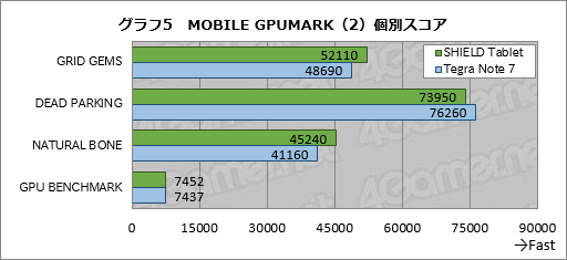 その結果はグラフ4,5のとおり。総合スコアは4テストすべての合算値で,あまり意味はないのだが,解像度が2.25倍も違うことを考えると,GRID GEMSとNATURAL BONEでSHIELD TabletがTegra Note 7より高いスコアを示したことは評価できそうだ。