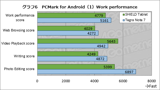 いずれにしても,ここでのテストルール「買ったままの状態で,ACアダプター駆動」という条件下において,PCMark for AndroidのスコアがTegra Note 7より若干低いスコアを示すのは,計測ミスではない。