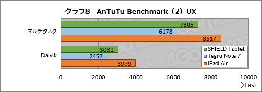 次にグラフ8はユーザーエクスペリエンス(UX)のスコアで,マルチタスキングの演算性能とユーザーインタフェース周りの性能を示している。