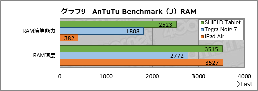 続いてメモリ性能を測るRAMの結果がグラフ8だ。「RAM演算性能」はメモリ城のデータ操作性能を,「RAM速度」はメモリの帯域幅をそれぞれ見るものとなる。