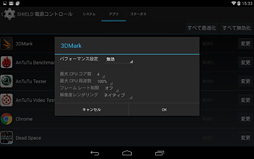 システム全体の電力制御においては,左下のスクリーンショットで示したとおり,「最大パフォーマンス」「最適化」「バッテリ節約」「マイパワーモード」と4つのプロセッサモードが用意されている(※工場出荷時設定は最適化)。Tegra K1をフルパワーで動作させる最大パフォーマンスと,自動制御に任せる最適化,CPUコアの動作クロックを落として運用するバッテリ節約の3つが基本設定で,マイパワーモードではユーザーが,使うCPUコアの最大数と(パーセンテージでの)CPUコアクロック値,そして20/30/45/60fpsから選択できるフレームレート上限設定を利用できる。