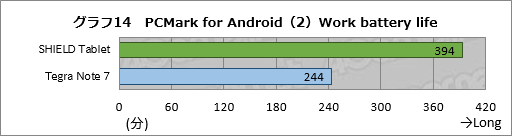 グラフ14は,いま述べたテスト条件におけるSHIELD TabletとTegra Note 7のバッテリー駆動時間を比較したものだ。SHIELD Tabletは6時間34分,Tegra Note 7は2時間4分なので,バッテリー駆動時間は1.6倍に伸びている計算になる。