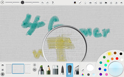 ![]() Dabblerの水彩モード。紙に絵の具が広がりながら染みこんでいく様子がリアルに再現される。ドライヤー機能を使えば瞬時に乾かすことも可能 |