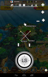 そのため,Gamepad Mapperの[LS]ボタンを画面上に配置すると,それだけで左アナログスティックによる移動操作が可能になる。[LS]ボタンは[Y][A]ボタンで拡大縮小が可能で,大きくした分だけスワイプ操作が大きくなるため,今回はかなり大きめに置いてある。
