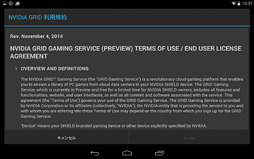 「GRIDゲーム」をサポートする新しい「SHIELD Hub」さえ導入済みであれば,Android 4.4.2(KitKat)版SHIELD Tabletでも利用できてしまうようである。下に示したのはその経緯だが,ご覧のとおり,「NVIDIA Account」を登録してログインすると,確かにGRID Game Streamingを利用できてしまった。