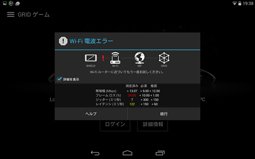 4Gamerの外部接続用回線にWi-Fi接続したところ,電波エラーが発生したが,今回はひとまず[続行]をタップ。するとGRIDゲームに戻った