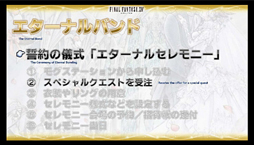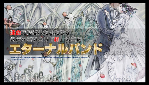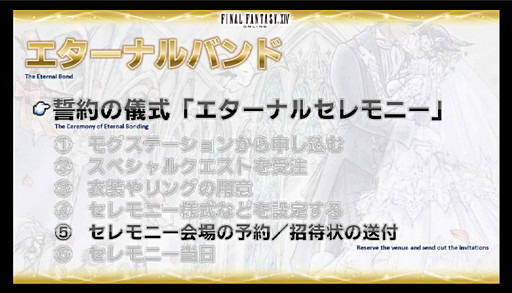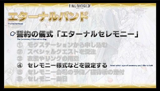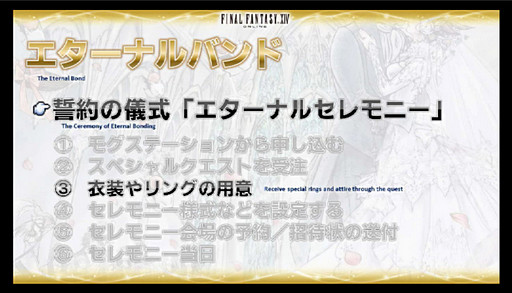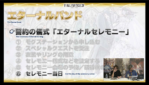 エターナルバンドは,特別な絆を持つ二人が,さまざまなクエストをこなして,「エターナルセレモニー」と呼ばれる誓約の儀式を執り行うというコンテンツだ。吉田氏曰く,このクエスト内容はリアルな(結婚式)ぐらいに,面倒くさいという。
