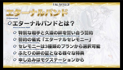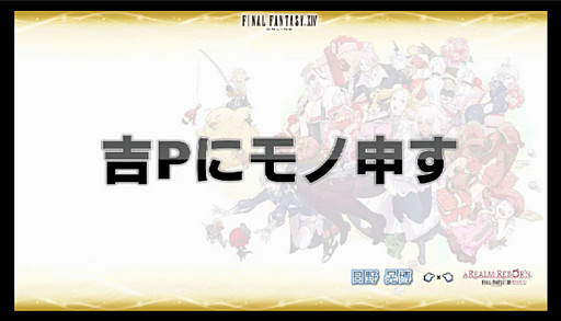 まず,吉田氏はパッチ2.45のリリース日が2014年12月9日になることを発表した。パッチ2.45では,一部の「ジョブバランスの調整」のほか,いわゆる結婚システムである「エターナルバンド」の実装,「ゾディアックウェポン」続編の追加,「レターモーグリ」の三つの新クエスト実装などが行われる予定とのことだ。