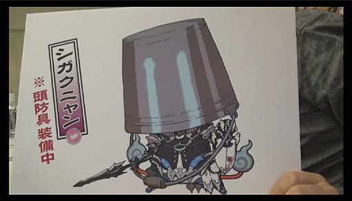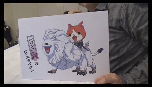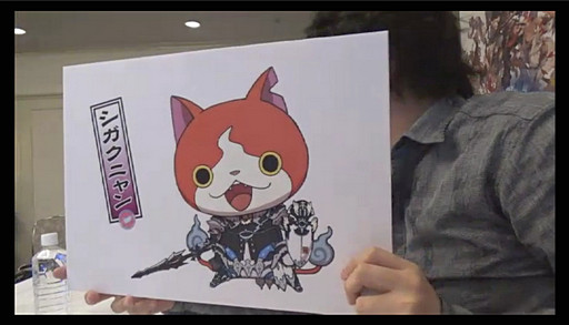 最初は同じゲーム業界の人間としてお手並み拝見のつもりでプレイを始めたが,いつしかハマってしまったという日野氏。今回,記念となるものを用意したいと考え,ナイトの詩学装備を着たジバニャン「シガクニャン」などのイラストを持参。このイラストは,「妖怪ウォッチ」のメインキャラクターデザイナーである長野拓造氏を社長室に呼び出して,描いてもらったとのことだ。