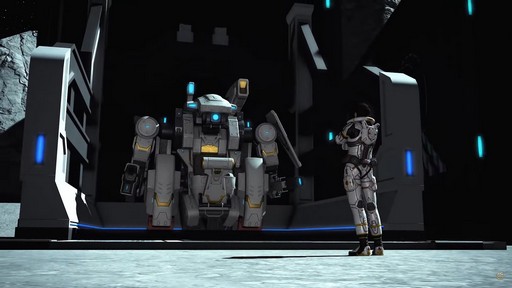 メカのパイロットは装着した武器で大きめの鉱石を破壊し,派手に採掘を行っていく