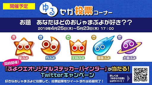 「ゆるセガ投票コーナー」では,「あなたはどのおじゃまぷよが好き??」というお題に沿い投票が行われる。実施期間は4月25日から5月23日17:00までだ