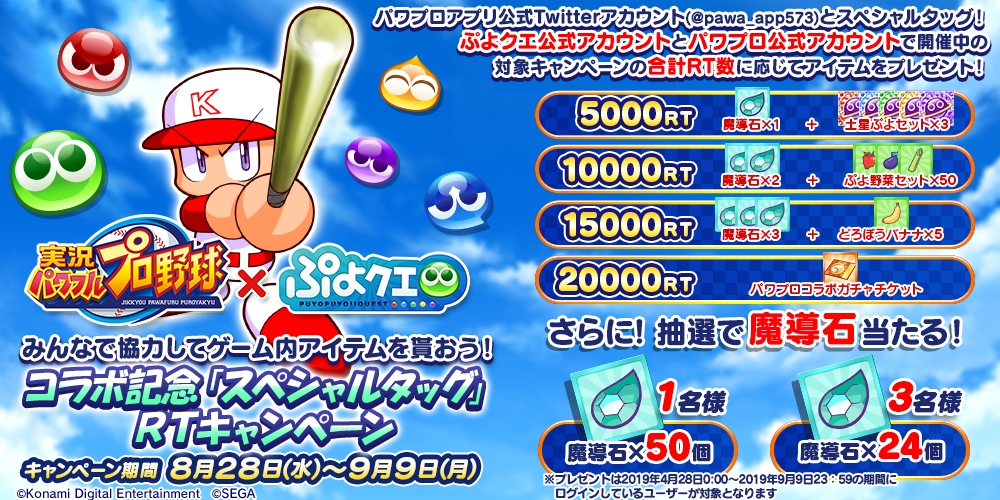 「ぷよぷよ!!クエスト」と「実況パワフルプロ野球」のコラボが決定。9月2日には記念の公式生放送を実施へ